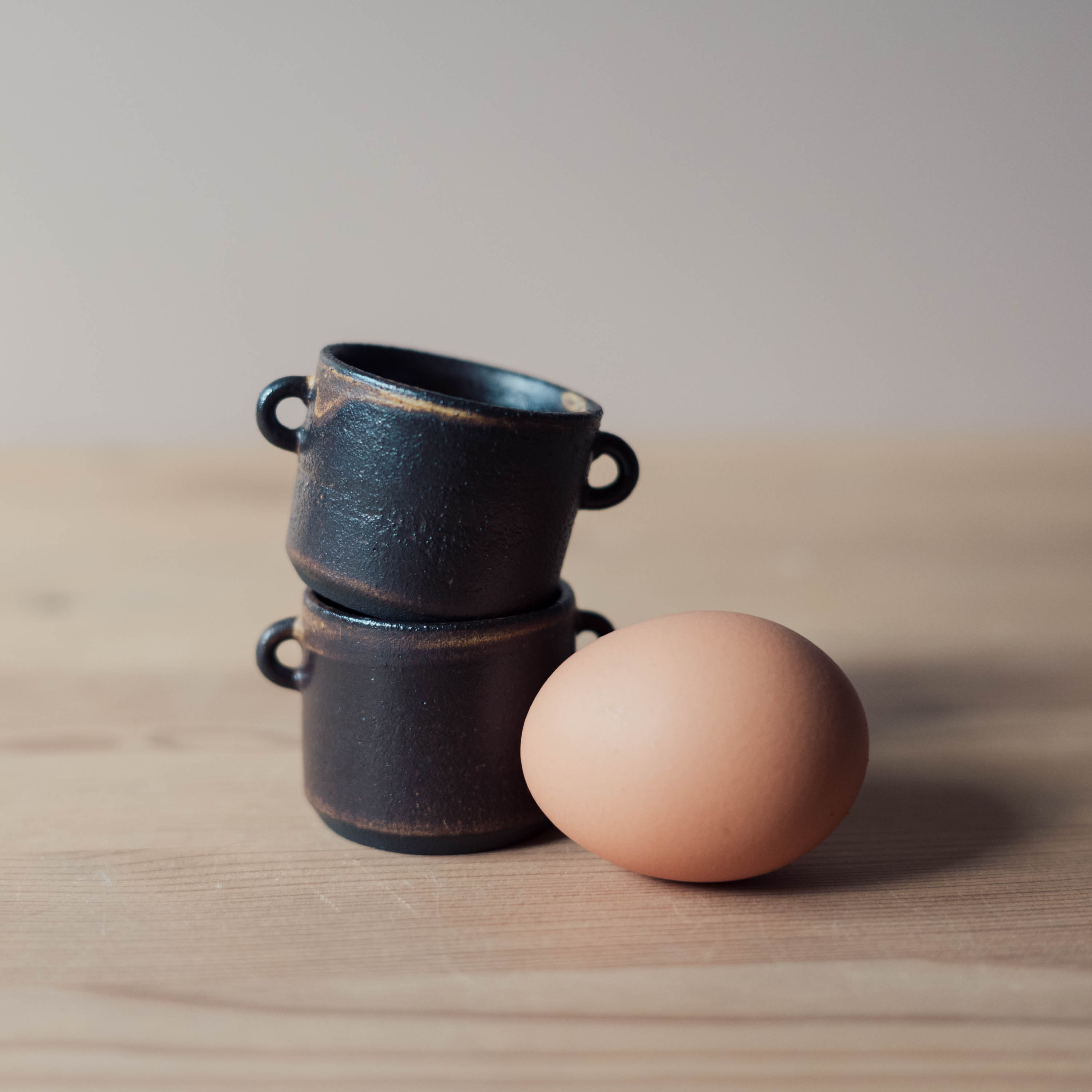 Handgjord äggkopp av svart lera med en brun ton i glasyren.