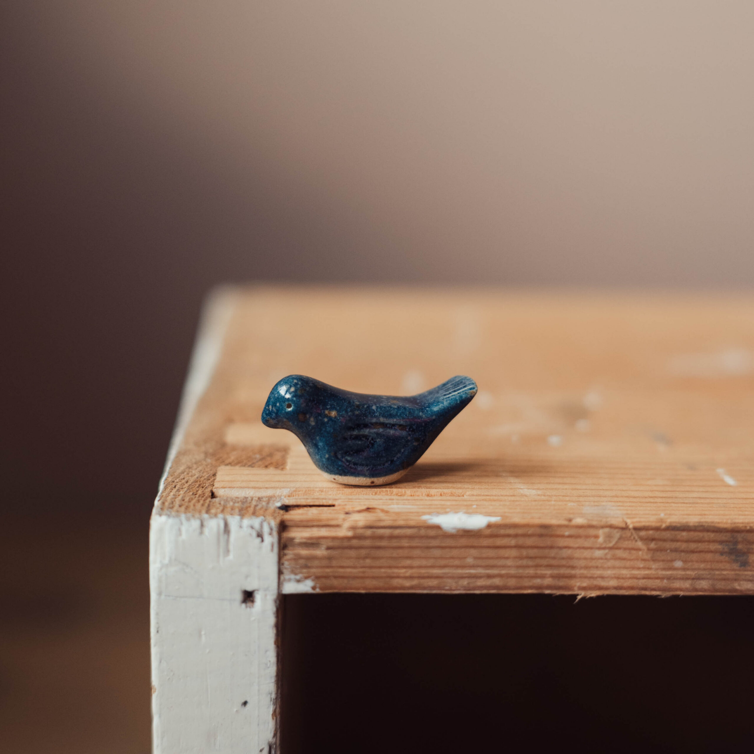 En liten handgjord fågel av stengods i mörkblå glasyr.