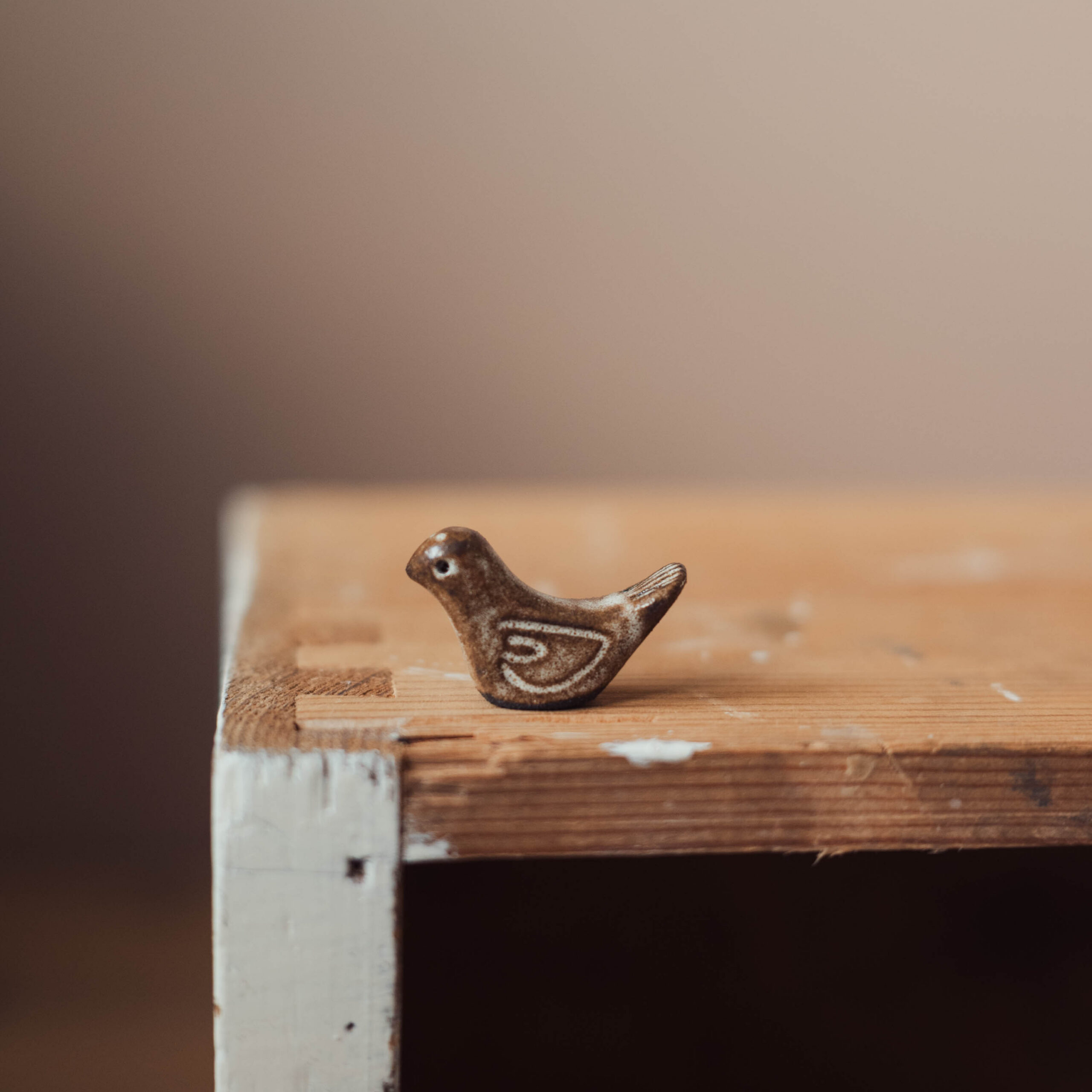 En liten handgjord fågel av stengods i rostfärgad glasyr.
